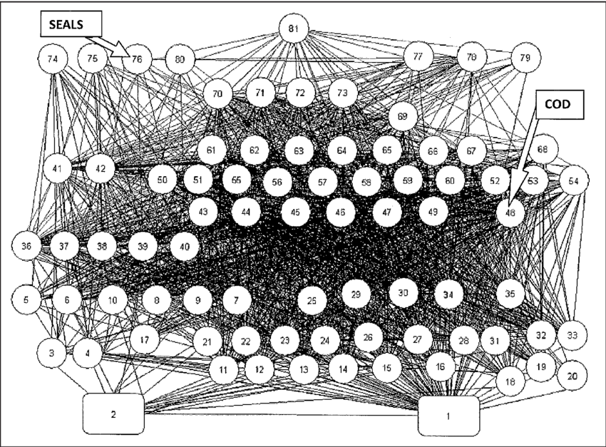 Typical example of a food web from the North Atlantic Ocean (Krebs, 2008). The black lines represent species interactions. Even this web is simplified; there are far more than 81 species (or even functional groups) in the ocean.
