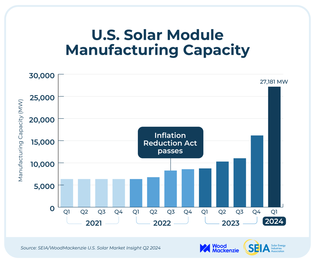 The United States has very rapidly increased its solar panel manufacturing capacity, in large part thanks to financial incentives such as the IRA clean energy tax credits. Credit: SEIA.org